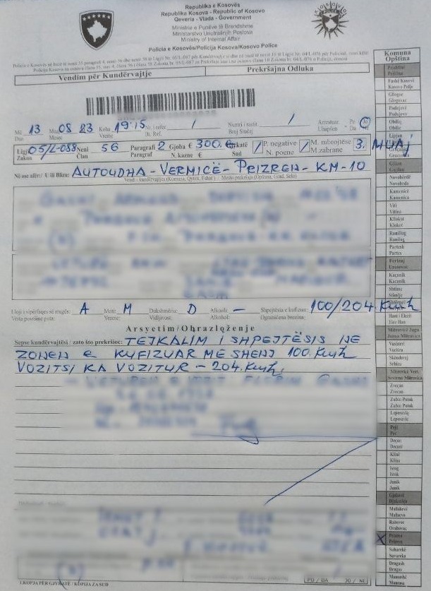 Policia e Kosovës ka bërë të ditur se ka gjobitur një person për tejkalim të shpejtësisë, me 300 euro gjobë dhe ndalim të drejtimit të automjetit për tre muaj.