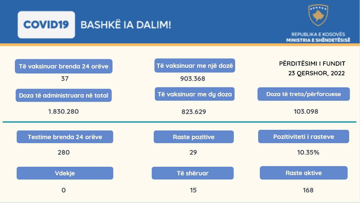Ministria e Shëndetësisë, sipas të dhënave nga Instituti Kombëtar i Shëndetësisë Publike të Kosovës, informon se janë 29 raste të reja me COVID-19.