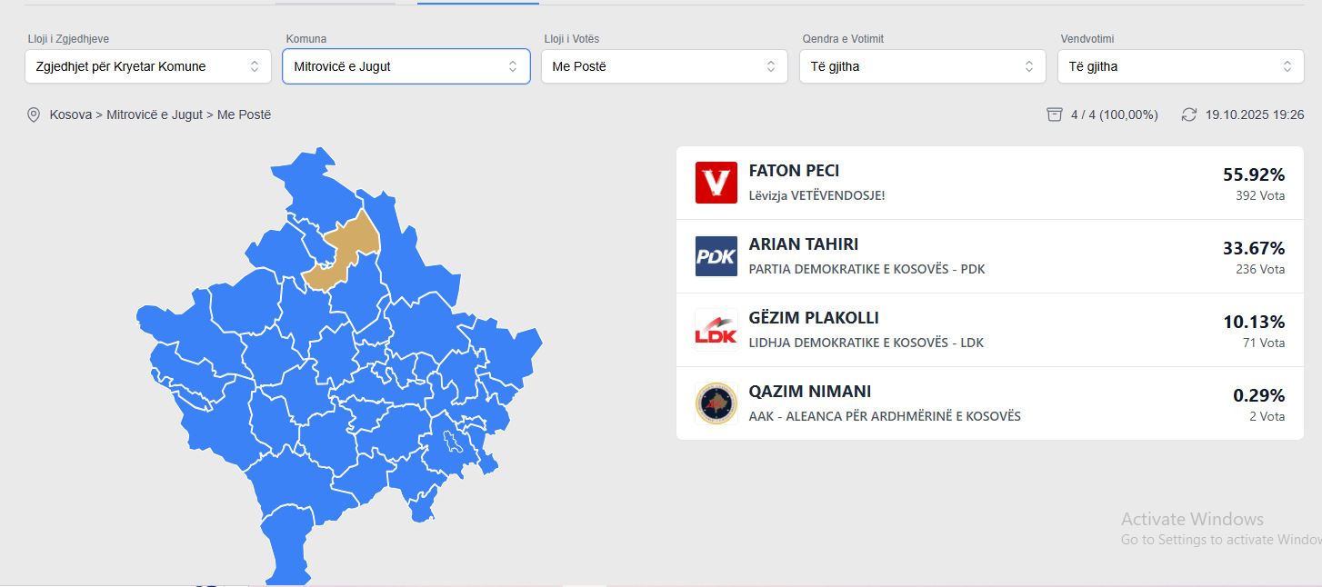 Bazuar në të dhënat e publikuar në faqen zyrtare të KQZ-së, kandidati i LVV-së Faton Peci, ka një epërsi prej 156 votash ndaj kandidatit të PDK-së Arian Tahirit.