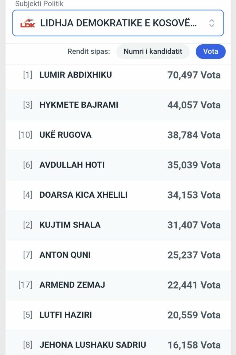 Kur janë numëruar 89.1% të votave për kandidatët për deputetë, në LDK prin Lumir Abdixhiku me 70,497 vota.