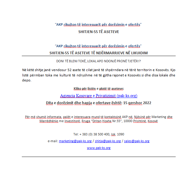 Për më shumë informata, palët e interesuara mund të kontaktojnë AKP-në, Njësinë për Marketing dhe Marrëdhënie me Investitorë, Rruga “Dritan Hoxha Nr.55”, 10000 Prishtinë, Kosovë