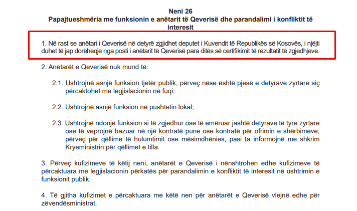 Pika e parë e Nenit 26 të këtij Ligji, thotë se në rast se një anëtar i Qeverisë në detyrë, zgjidhet deputet i Kuvendit të Republikës së Kosovës, i njëjti duhet të japë dorëheqje nga posti i anëtarit të Qeverisë, para ditës së certifikimit të rezultatit të zgjedhjeve.