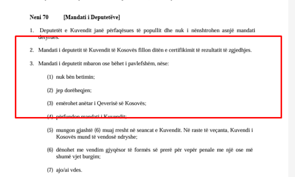 “Mandati i deputetit mbaron ose bëhet i pavlefshëm, nëse: (1) nuk bën betimin; (2) jep dorëheqjen; (3) emërohet anëtar i Qeverisë së Kosovës;”, thuhet në Kushtetutën e Republikës së Kosovës.