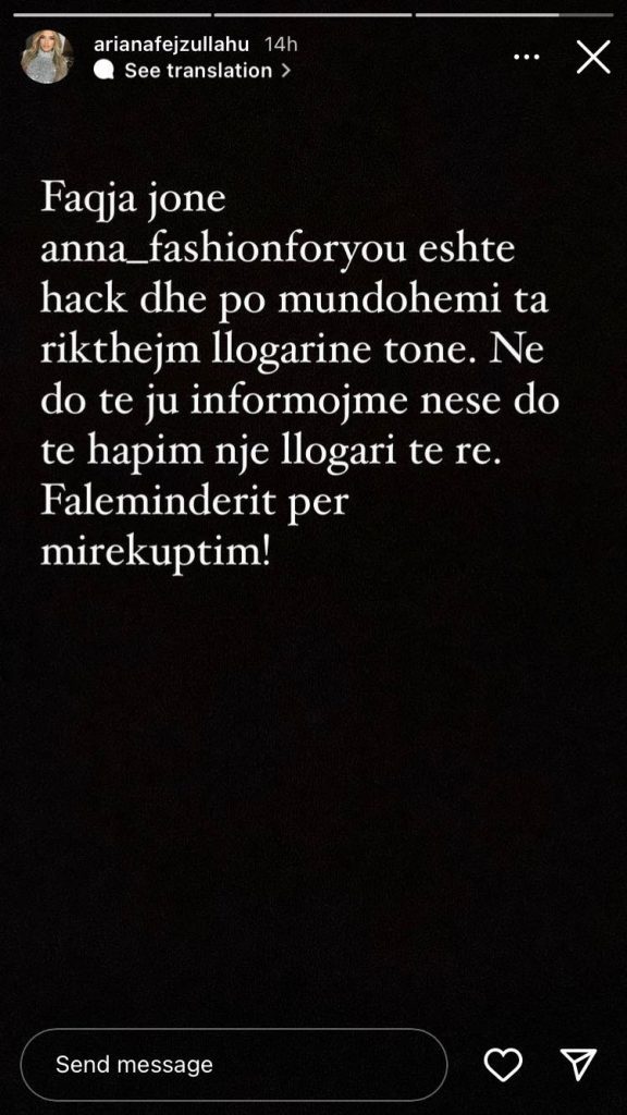 Ariana Fejzullahut, gruas së këngëtarit Ermal Fejzullahut i është hakuar faqja biznesore në Instagram.