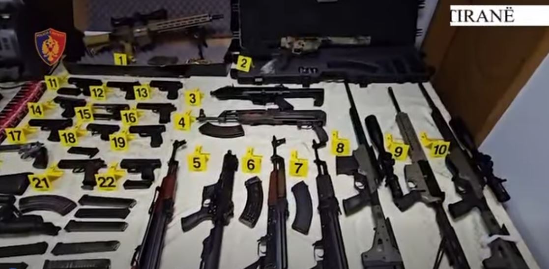 ” Sekuestrohen 23 armë zjarri (5 prej tyre me snajper), 1 silenciator, 17 krehra me municion luftarak, celularë dhe pajisje për shpërthime në distancë, paisje për bllokimin e valëve, uniforma si të Policisë dhe sende të tjera të kundërligjshme”, thuhet në njoftimin e Policisë së Shtetit.