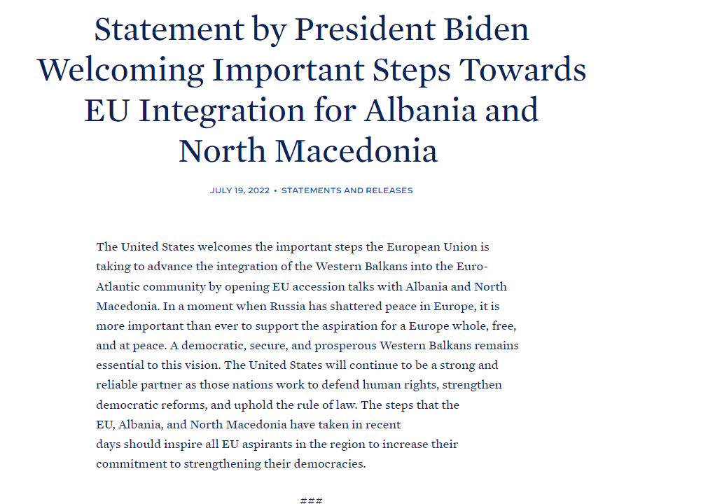 “Shtetet e Bashkuara mirëpresin hapat e rëndësishëm që Bashkimi Evropian po ndërmerr për të çuar përpara integrimin e Ballkanit Perëndimor në komunitetin euroatlantik duke hapur bisedimet e pranimit në BE me Shqipërinë dhe Maqedoninë e Veriut. Në një moment kur Rusia ka shkatërruar paqen në Evropë, është më e rëndësishme se kurrë të mbështesim aspiratën për një Evropë të plotë, të lirë dhe në paqe. Një Ballkan Perëndimor demokratik, i sigurt dhe i begatë mbetet thelbësor për këtë vizion. Shtetet e Bashkuara do të vazhdojnë të jenë një partner i fortë dhe i besueshëm ndërsa ato vende punojnë për të mbrojtur të drejtat e njeriut, për të forcuar reformat demokratike dhe për të mbështetur sundimin e ligjit. Hapat që BE, Shqipëria dhe Maqedonia e Veriut kanë ndërmarrë ditët e fundit duhet të frymëzojnë të gjithë aspirantët e BE-së në rajon për të rritur angazhimin e tyre për forcimin e demokracive të tyre”, deklaroi Presidenti Biden në mesazhin e publikuar nga Shtëpia e Bardhë.