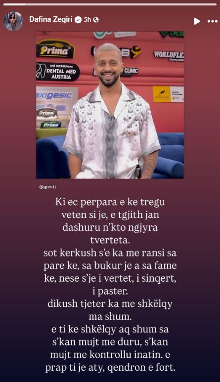 “Ki ec përpara e ke tregu veten si je, e të gjithë janë dashuru në këto ngjyra të vërteta. Sot kërkush s’e ka me ransi sa pare ke, sa bukur je a sa famë ke, nëse s’je i vërtetë, i sinqertë, i pastër. Dikush tjetër ka më shkëlqy ma shumë, e ti ke shkëlqy aq shumë sa s’kan mujt me duru, s’kaë mujtë me kontrollu inatin e prap ti je aty, qëndron i fort”, shkroi Dafina.