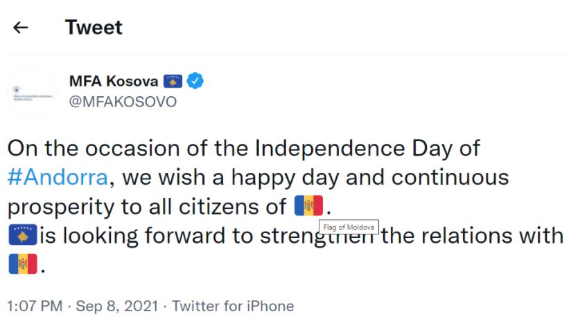 Kurse, të duke ia uruar Ditën e Pavarësisë, Andorrës, kishte ngatërruar flamurin duke e vendosur atë të Moldavisë.
