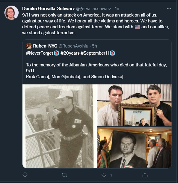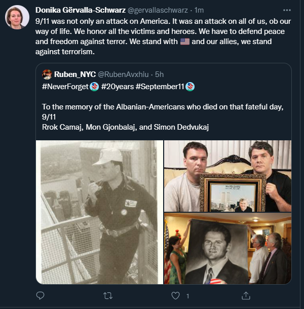 “11 shtatori nuk ishte vetëm një sulm ndaj Amerikës. Ishte një sulm ndaj të gjithëve ne, kundër mënyrës sonë të jetesës. Ne nderojmë të gjithë viktimat dhe heronjtë. Ne duhet të mbrojmë paqen dhe lirinë kundër terrorit. Ne qëndrojmë me Shtetet e Bashkuara të Amerikës dhe aleatët tanë, ne qëndrojmë kundër terrorizmit”, ka shkruar ajo në postimin e dytë në Twitter.
