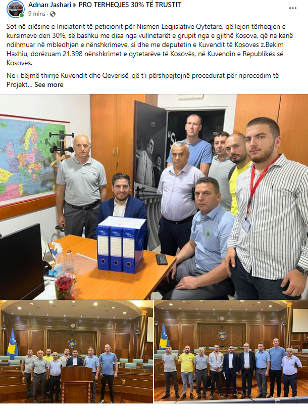 Sot në cilësine e Iniciatorit të peticionit për Nismen Legjislative Qytetare, që lejon tërheqjen e kursimeve deri 30%, së bashku me disa nga vullnetarët e grupit nga e gjithë Kosova, që na kanë ndihmuar në mbledhjen e nënshkrimeve, si dhe me deputetin e Kuvendit të Kosoves z.Bekim Haxhiu, dorëzuam 21.398 nënshkrimet e qytetarëve të Kosovës, në Kuvendin e Republikës së Kosovës.