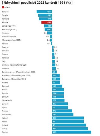 Rekordin në Europë për tkurrjen e popullsisë nga fillim vitet 1990 e mban Bulgaria, me -21.1, e ndjekur nga Kroacia (-18.9) dhe Rumania (-17.9).