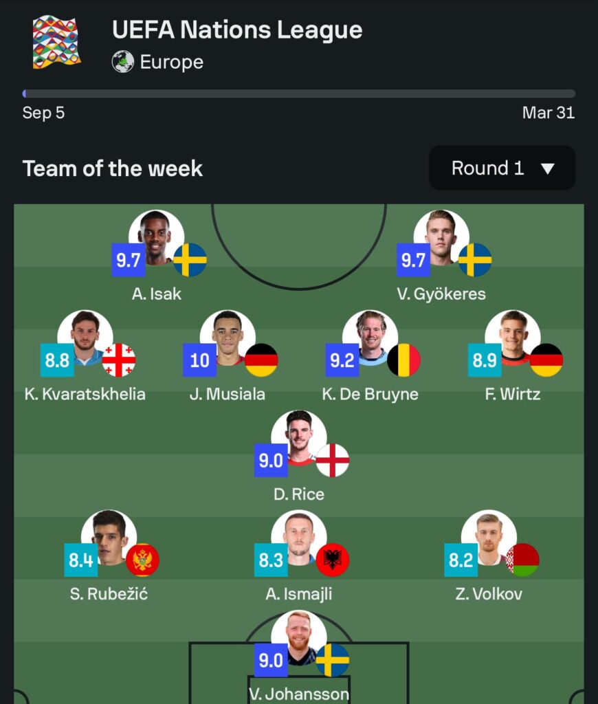 Formacioni më i mirë: Johansson, Rubezic, Ismajli, Volkov, Rice, Kvaratskhelia, Musiala, De Bruyne, Wirtz, Isak e Gyokeres.