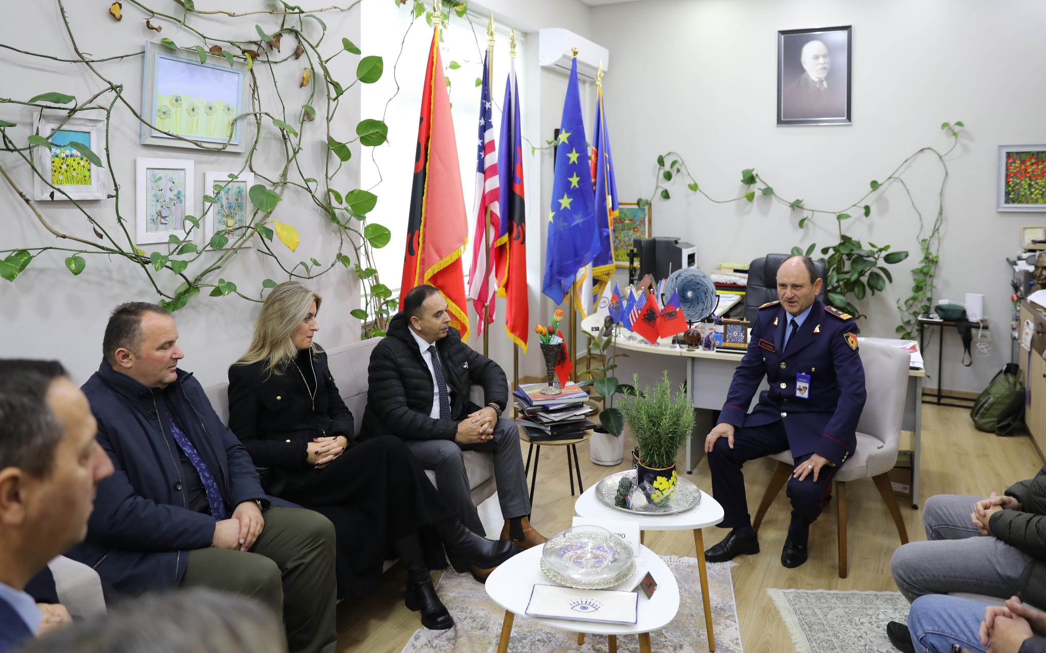 Kryetarët e dy Sindikatave Policore, z.Avdi Hoti dhe z.Sadedin Fishta me stafin menaxhues, fillimisht u pritën në takim zyrtar nga Rektori i Akademis së Sigurisë Prof.Dr. Ilirjan Mandro, nga ku përçuan mesazhe të fuqishme të bashkimit, bashkëpunimit dhe kremtimit të përbashkët të festave të ndryshme ndërshtetërore.