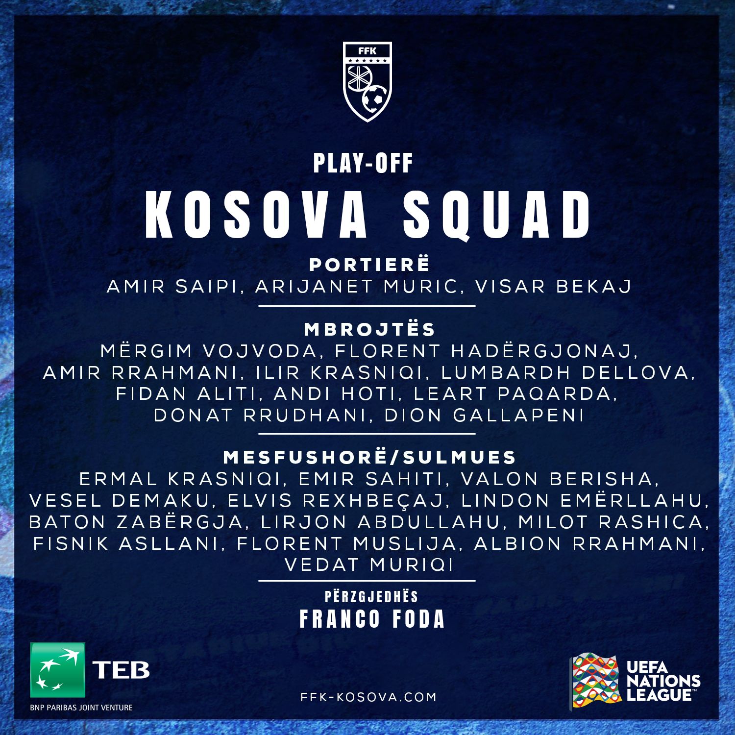 FFK ka publikuar listën me futbollistët e ftuar nga përzgjedhësi Franco Foda për ndeshjet e muajit mars.
