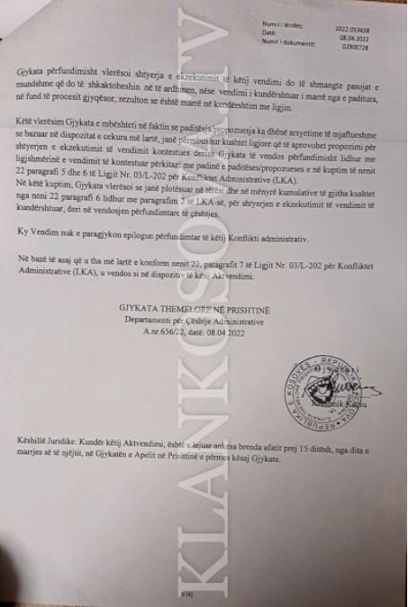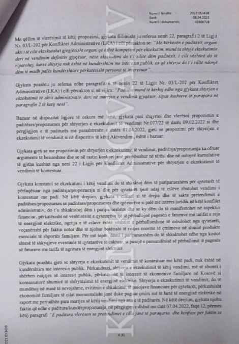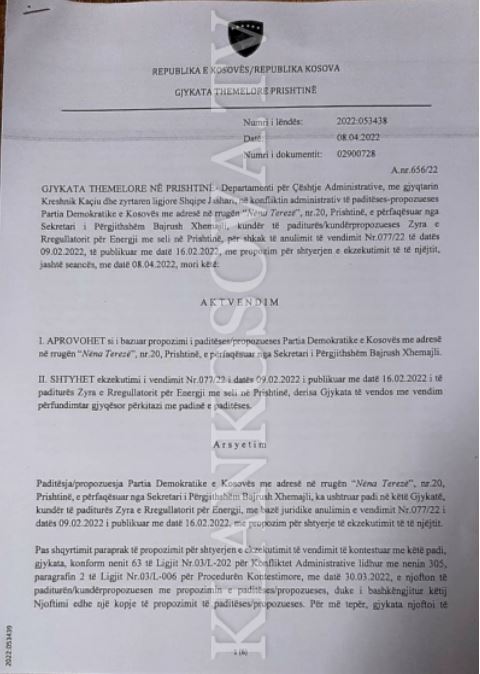 “SHTYHET ekzekutimi i vendimit nr.077/22 i datës 09.02.2022 i publikuar më datë 16.02.2022 i të paditurës Zyra e Rregullatorit për Energji me seli në Prishtinë, derisa gjykata të vendos me vendim përfundimtar gjyqësor përkitazi me padinë e paditëses”, thuhet në dokumentin e gjykatës të siguruar nga Klankosova.tv