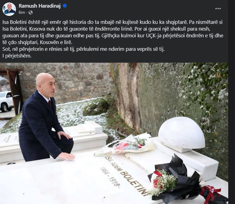 “Isa Boletini është një emër që historia do ta mbajë në kujtesë kudo ku ka shqiptarë. Pa nismëtarë si Isa Boletini, Kosova nuk do të guxonte të ëndërronte lirinë. Por ai guxoi një shekull para nesh, guxuan ata para tij dhe guxuan edhe pas tij. Gjithçka kulmoi kur UÇK-ja përjetësoi ëndrrën e tij dhe të çdo shqiptari, Kosovën e lirë. Sot, në përvjetorin e rënies së tij, përkulemi me nderim para veprës së tij. I përjetshëm”, ka shkruar Haradinaj.