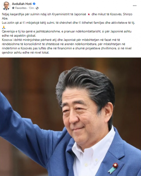 “Ndjej keqardhje për sulmin ndaj ish Kryeministrit të Japonisë ?? dhe mikut të Kosovës, Shinzo Abe. Lus zotin që ai t’i mbijetojë këtij sulmi, të shërohet dhe t’i kthehet familjes dhe aktiviteteve të tij. ?”, ka shkruar Hoti.