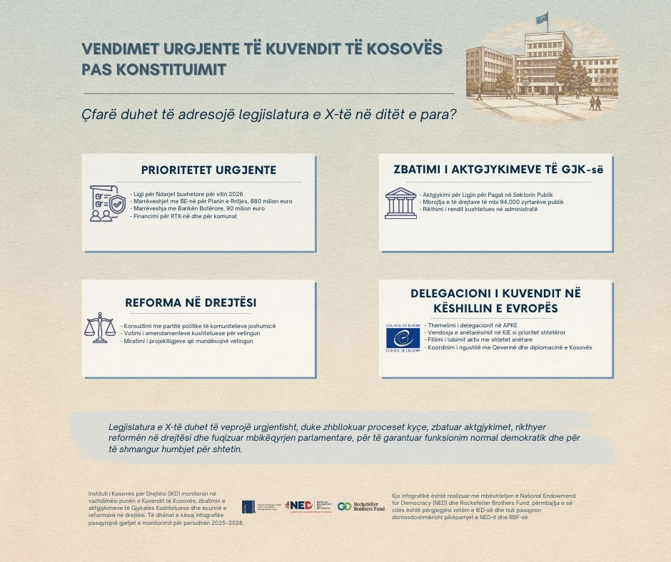 Instituti i Kosovës për Drejtësi vlerëson se legjislatura e re duhet të veprojë me urgjencë, përgjegjësi dhe transparencë , duke ç’bllokuar proceset kyçe, zbatuar aktgjykimet kushtetuese dhe forcuar rolin mbikëqyrës të Kuvendit, në funksion të garantimit të rendit demokratik dhe interesit publik.