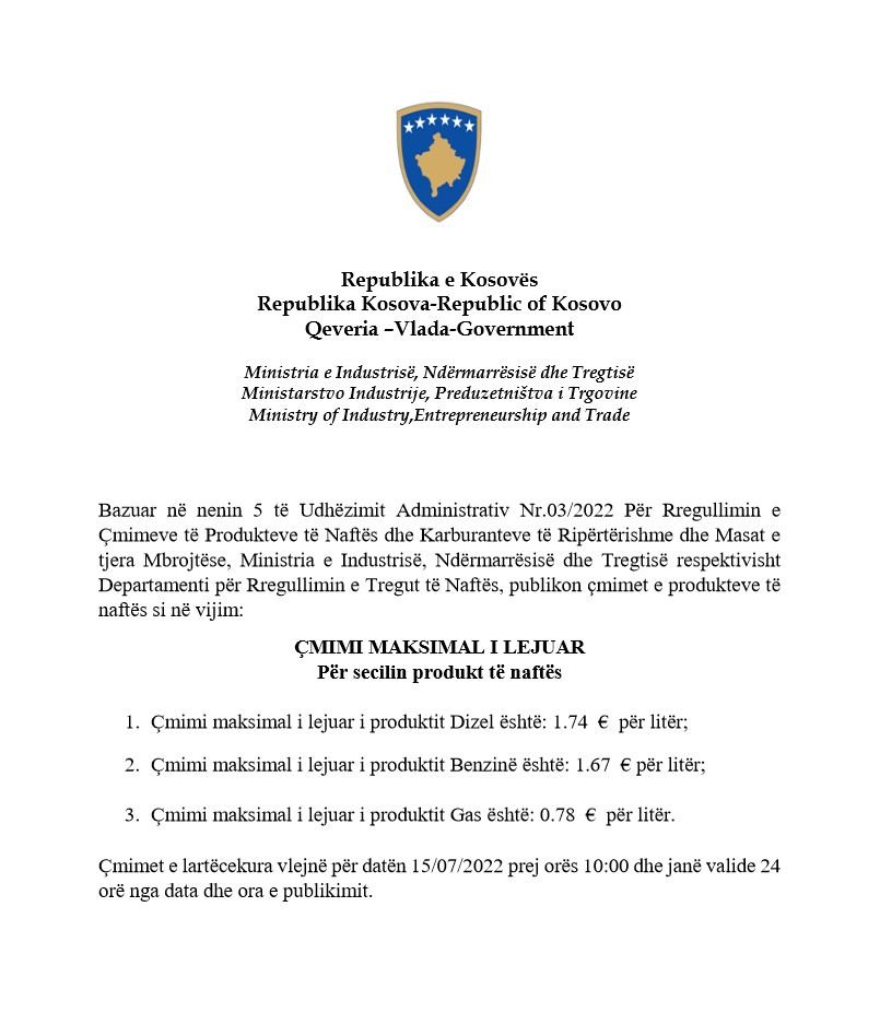 Bazuar në nenin 5 të Udhëzimit Administrativ Nr.03/2022 Për Rregullimin e Çmimeve të Produkteve të Naftës dhe Karburanteve të Ripërtërishme dhe Masat e tjera Mbrojtëse, Ministria e Industrisë, Ndërmarrësisë dhe Tregtisë respektivisht Departamenti për Rregullimin e Tregut të Naftës, publikon çmimet e produkteve të naftës si në vijim: