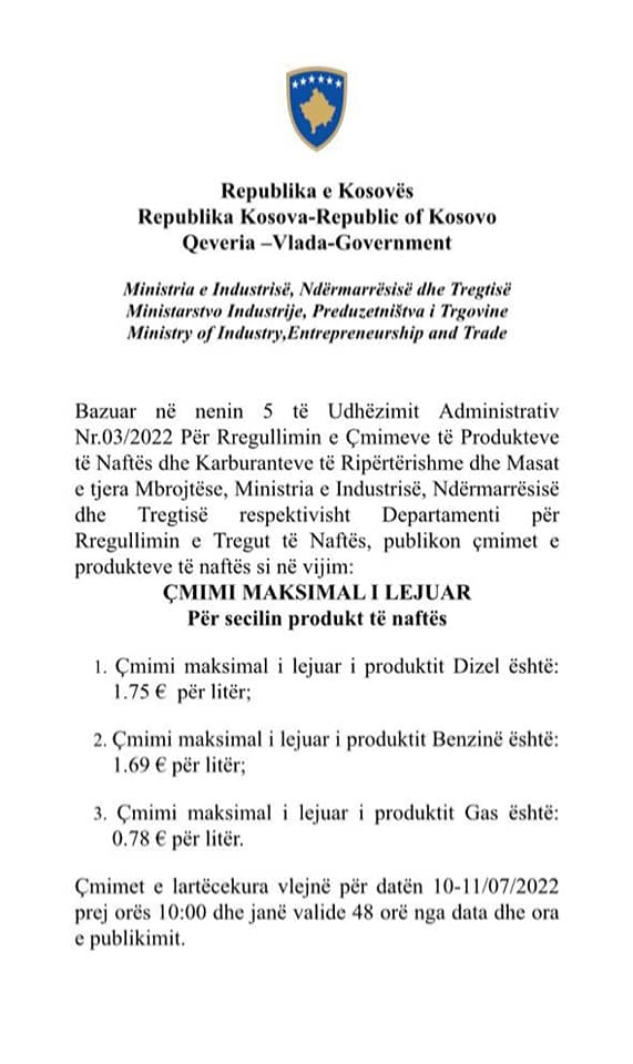 Sipas njoftimit, çmimi maksimal i lejuar i Dizel është 1.75 € për litër, i benzinës 1.69 € për litër dhe i gasit 0.78 € për litër.