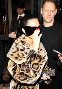 Në foton e zmadhuar, Kim, 43 vjeçe, mban iPhone-in në njërën dorë ndërsa tjetrën e mban aty pranë syzeve të saj të mëdha.