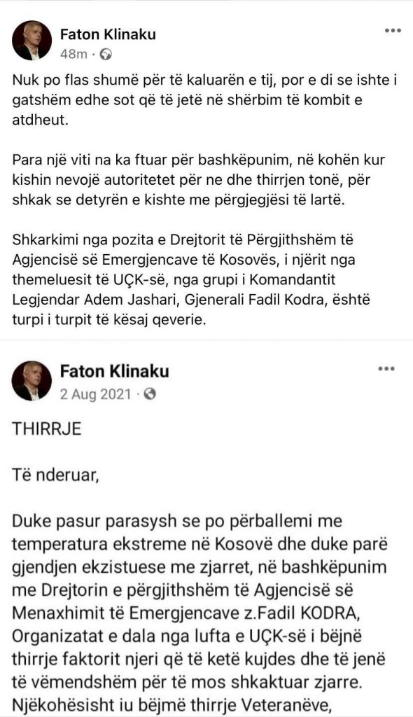 “Shkarkimi nga pozita e Drejtorit të Përgjithshëm të Agjencisë së Emergjencave të Kosovës, i njërit nga themeluesit të UÇK-së, nga grupi i Komandantit Legjendar Adem Jashari, Gjenerali Fadil Kodra, është turpi i turpit të kësaj qeverie”, ka shkruar mes tjerash ai.