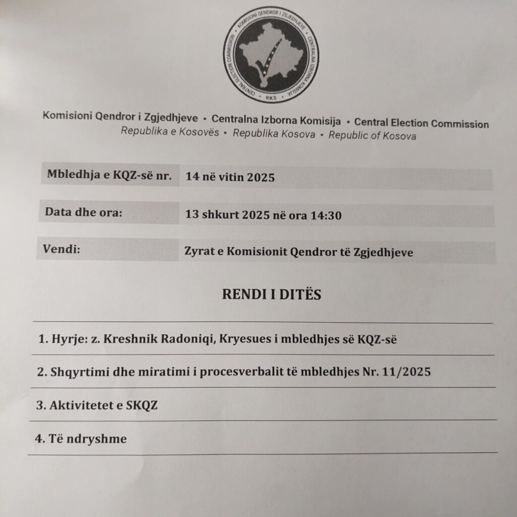 Komisioni Qendror i Zgjedhjeve (KQZ) njofton se sot, më 13 shkurt 2025, në ora 14:30, do të mbahet mbledhja e radhës, raporton GazetaBlic.