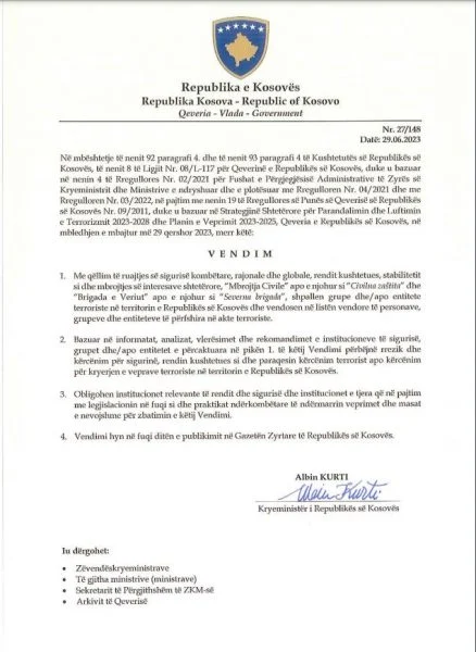 Në vendim thuhet se me qëllim të ruajtjes së sigurisë kombëtare, rajonale dhe globale, rendit kushtetues, stabilitetit si dhe mbrojtjes së interesave shtetërore, “Mbrojtja Civile” apo e njohur si “Civilna zaštita” dhe “Brigada e Veriut” apo e njohur si “Severna brigada”, shpallen grupe dhe/apo entitete terroriste në territorin e Republikës së Kosovës dhe vendosen në listën vendore të personave, grupeve dhe entiteteve të përfshira në akte terroriste.