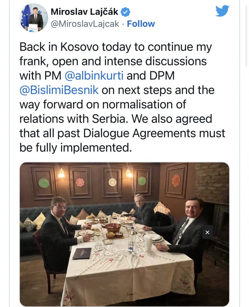 “U ktheva në Kosovë për diskutimet e sinqerta, të hapura dhe intensive me Kryeministrin Albin Kurti dhe zv.kryeministrin Besnik Bislimi për hapat e mëtutjeshëm drejt normalizimit të raporteve me Serbinë. Po ashtu, u pajtuam që të gjitha marrëveshjet e arritura më parë në Dialog, duhet të zbatohen plotësisht”, ka shkruar Lajcak.
