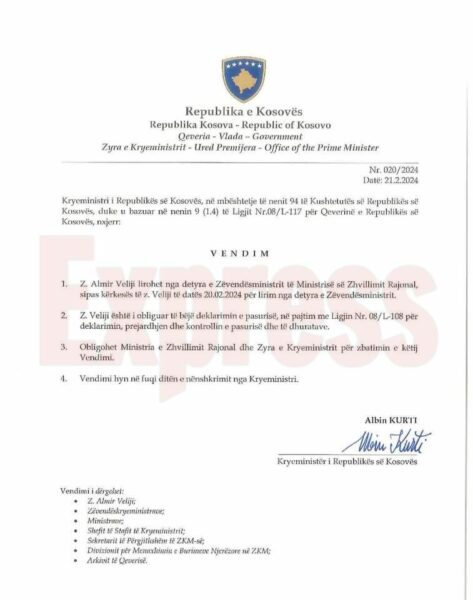 Kryeministri Albin Kurti ka marrë vendim që ta lirojë atë nga detyra, sipas kërkesës që vetë ai ia ka bërë të martën shefit të Qeverisë.