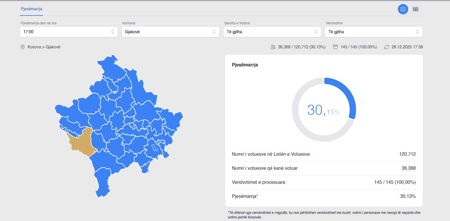 “Po ashtu duke u mbështetur në të dhënat preliminare që kemi marrë nga 96% e vendvotimeve, numri i qytetarëve me të drejtë vote që kanë votuar deri në orën 15:00 është 572 mijë e 726 votues, apo 28.65% nga 1 milion 999 e 204 votues”, tha ai.