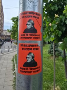 “Për Halloween bonu si Dejona… Maska më e frikshme në institucionet e Kosovës”, është shkrimi që i është vendosur afishes.