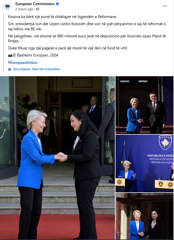 Komisioni Evropian në faqen zyrtare në Facebook ka shkruar për vizitën e presidentes Ursula Von Der Leyen, në Kosovë ku ka potencuar edhe çështjen e para pagesave, të cilat synohet të bëhen para fundit të vitit.