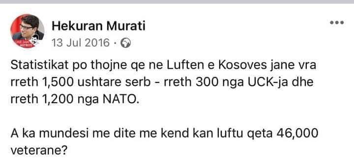 Përmes një postimi në Facebook, ai ka thënë se Murati i ka dhënë dy deklarata fyese e poshtëruese kundër shqiptarëve, e para që ka të bëjë me UÇK-në dhe e dyta për “1200 ushtarë të vrarë të NATO-s, ndërsa 300 nga radhët e UÇK-së”!