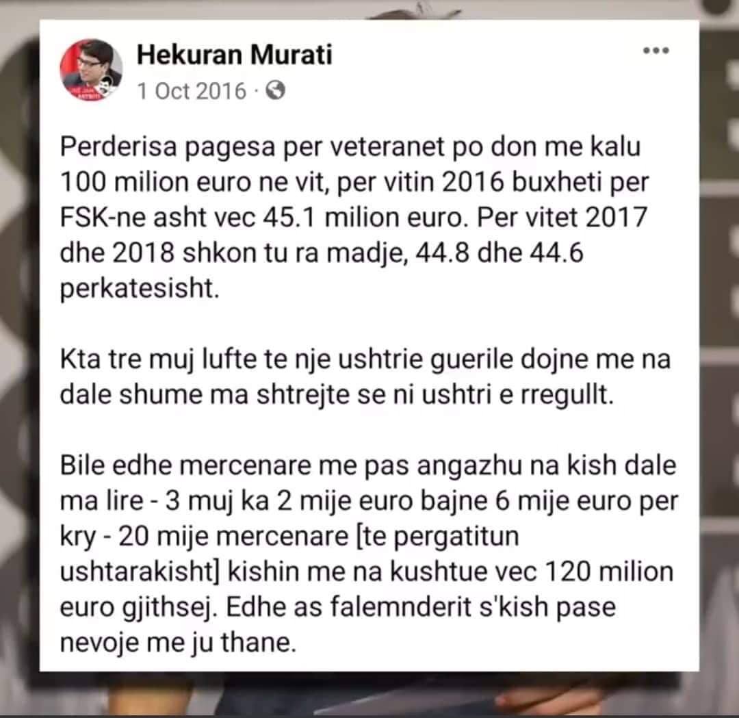 “Bile edhe mercenarë me pas angazhu na kish dalë më lirë – 3 muaj ka 2 mijë euro bëjnë 6 mijë euro për kokë – 20 mijë mercenarë (të përgatitun ushtarakisht) kishin me na kushtu veç 120 milionë euro gjithsej. Edhe as faleminderit s’kish pasë nevojë me iu thanë”, pati shkruar Murati.