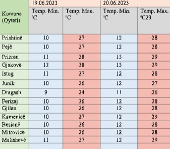 IHLK njofton se temperaturat minimale do të lëvizin ndërmjet 11-13 gradë Celsius, ndërsa maksimalet e ditës parashihen të lëvizin ndërmjet 26-29 gradë Celsius.