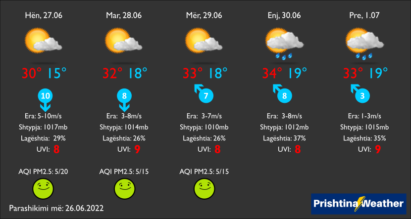 Valë e nxehtësisë në ditët e fundit të qershorit. Kryesisht me diell e temperatura maksimale edhe deri në 35C.