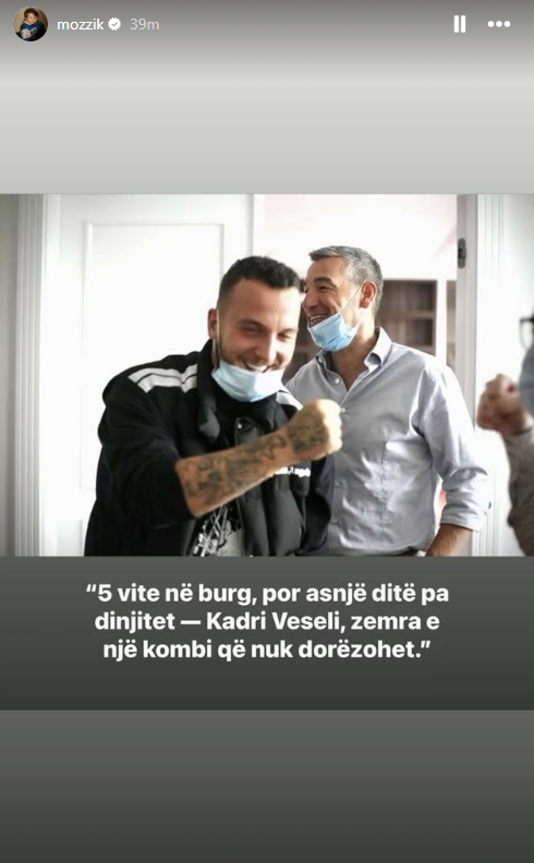 “5 vjet në burg, por asnjë ditë pa dinjitet – Kadri Veseli, zemra e një kombi që nuk dorëzohet”, shkroi Mozzik.