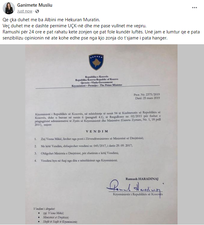 Deputetja e PDK-së, Ganimete Musliu, ka shkruar në Facebook se nëse kryeministri, Albin Kurti dhe ministri Hekuran Murati, njëmend e duan UÇK-në, ky i fundit tashmë do të ishte i shkarkuar.