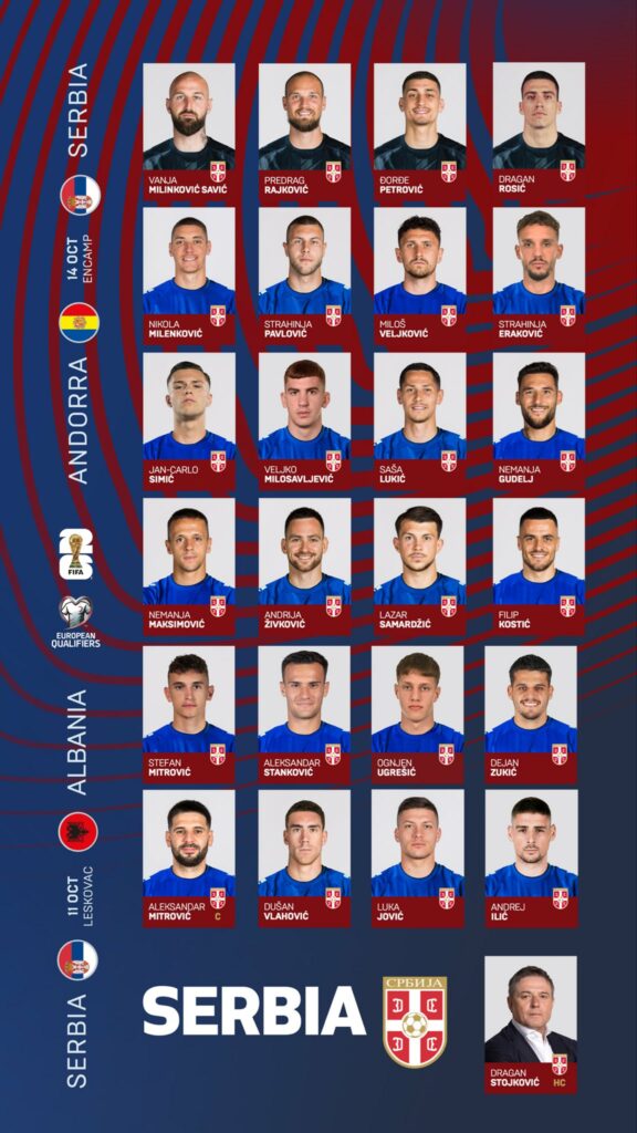 Trajneri i Serbisë, Dragan Stojkovic ka publikuar listën me futbollistët e ftuar për ndeshjen e 11 tetorit me Shqipërinë dhe atë tre ditë më vonë ndaj Andorës./IndeksOnline/