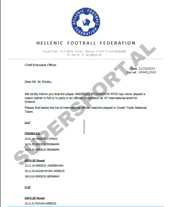 Mesfushori 19-vjeçar ka njoftuar Federatën Shqiptare të Futbollit për zgjedhjen e tij, duke deklaruar se vendimi përfundimtar është që të jetë pjesë e përfaqësueses greke.