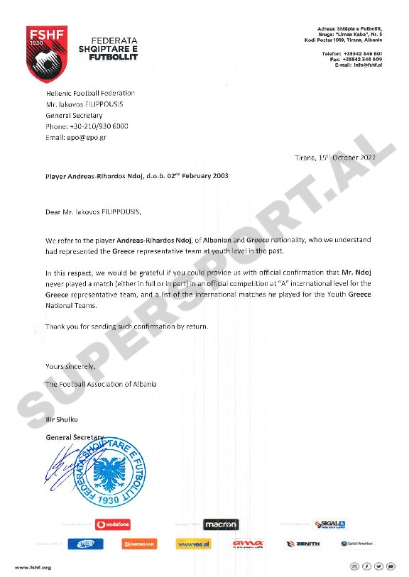 Federata Shqiptare e Futbollit iu drejtua fillimisht homologëve në Greqi për të konfirmuar se Ndoj nuk ka luajtur me ekipin e parë të helenëve, çka i krijojnë kushtet për t’u bashkuar me skuadrën kuqezi, shkresë që daton në 15 tetor dhe gjashtë ditë më vonë federata greke vuri në dijeni me një shkresë zyrtare, ndeshjet e moshave ku 19-vjeçari ishte aktivizuar.