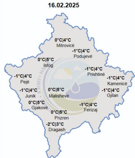 Temperaturat minimale pritet të jenë nga -2 deri 0°C, ndërsa maksimalet do të lëvizin nga 3°C deri në 5°C.