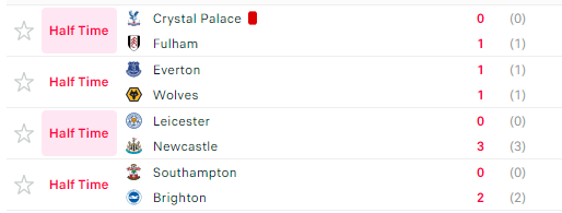 Fulham është në avantazh 0 me 1 ndaj Crystal Palace, kurse Everton dhe Wolves po luajnë me rezultat 1 me 1.