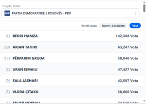 Në PDK, Bedri Hamza kryeson listën, i ndjekur nga Arian Tahiri, Perparim Gruda, Uran Ismaili dhe Sala Jashari.