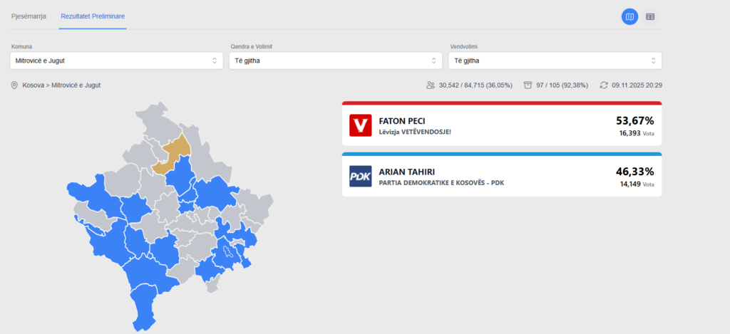 Komisioni Qendror i Zgjedhjeve ka numëruar 92,38 për qind të votave në Komunën e Mitrovicës së Jugut.