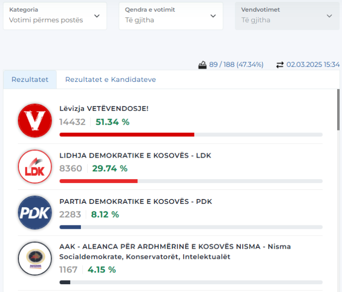 Lëvizja Vetëvendosje deri tani ka marrë 14,432 vota apo 51.34%.