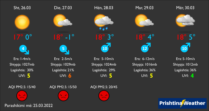 27.03 – Ngrohtë, kthjellët dhe me diell. Në mbrëmje vransira kalimtare.