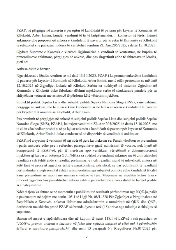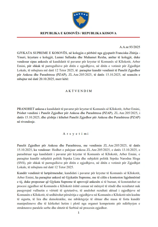 Gjykata Supreme e Kosovës ka njoftuar se ka pranuar si të bazuar ankesën e kandidatit të pavarur për kryetar të Komunës së Kllokotit, Arber Emini, duke prishur vendimin e mëparshëm të Panelit Zgjedhor për Ankesa dhe Parashtresa (PZAP), me numër ZL.Anr.205/2025, të datës 15 tetor 2025.