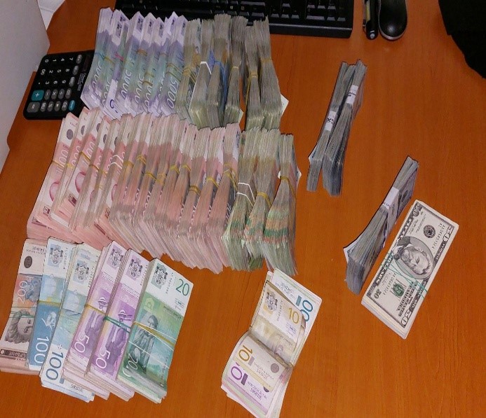 “Gjatë kontrollit më të detajuar, në vijë të dytë të kontrollit, në brendi të automjetit, të fshehura dhe të maskuara janë zbuluar dy qese të najlonit. Gjatë procedurave të tjera të kontrollit, janë zbuluar 35600 USD (tridhjetë e pesë mijë e gjashtëqind dollarë amerikanë) dhe 6.653.590 RSD (gjashtë milionë e gjashtëqind e pesëdhjetë e tre mijë e pesëqind e nëntëdhjetë dinarë serbë)”, njofton policia.